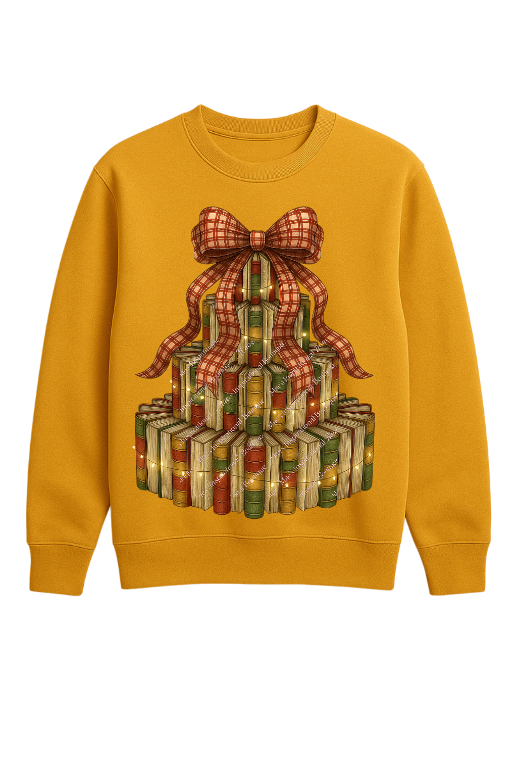 Celebrate the holidays with this beautiful Christmas Book Tree PNG, a high-resolution digital download perfect for sublimation, printing, or digital design. This cozy artwork features a Christmas tree made of stacked vintage books in rich red, green, and gold tones, topped with a plaid bow and warm glowing lights — the perfect mix of festive and bookish charm.